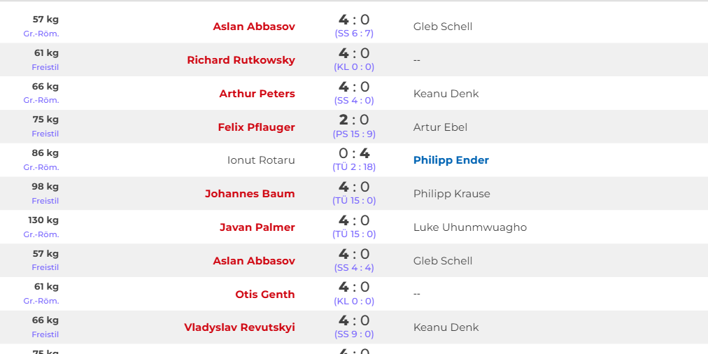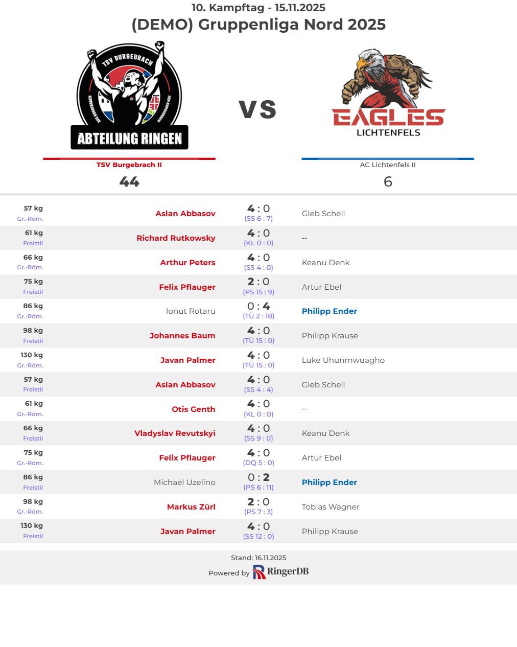 Der zukünftige Meister der Gruppenliga Nord aus dem Landkreis Bamberg lies der Bundesliga- Reserve aus der Korbstadt keine Chance und gewann zwölf der insgesamt 14 Kämpfe meist überlegen. Die beiden Siege für den ACL konnte in der Klasse 86kg sowohl im Freistil als auch im Greco Philipp Ender erkämpfen, der einmal überlegen und einmal nach Punkten erfolgreich war. Artur Ebel und Tobias Wagner unterlagen knapp nach Punkten. Alle anderen Kämpfe gingen überlegen an den Gastgeber vom TSV Burgebrach.