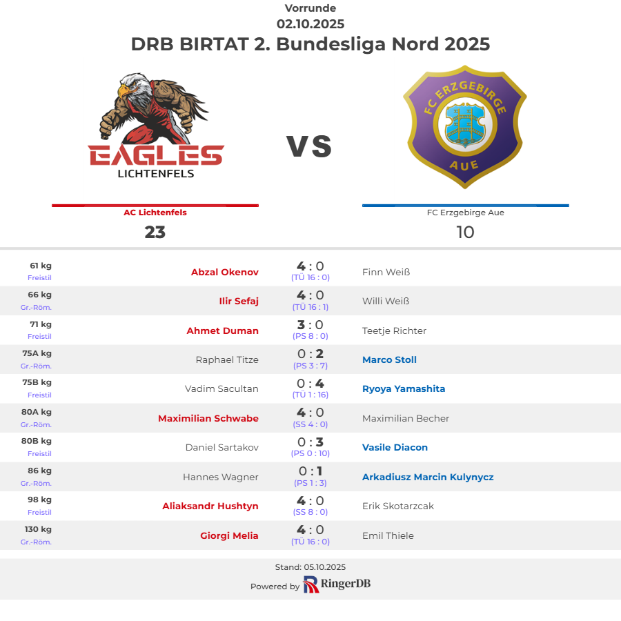 Lichtenfels – Die Eagles Lichtenfels haben zum Rundenauftakt in der 2. Liga Nord einen klaren Sieg in der heimischen AC-Halle gefeiert. Rund 400 Zuschauern kamen am Donnerstagabend und sahen einen 23:10-Sieg über den FC Erzgebirge Aue. Sechs der zehn Einzelkämpfe gingen an die Lichtenfelser Ringer. Fünf davon mit der maximal möglichen Punktzahl von vier Zählern.