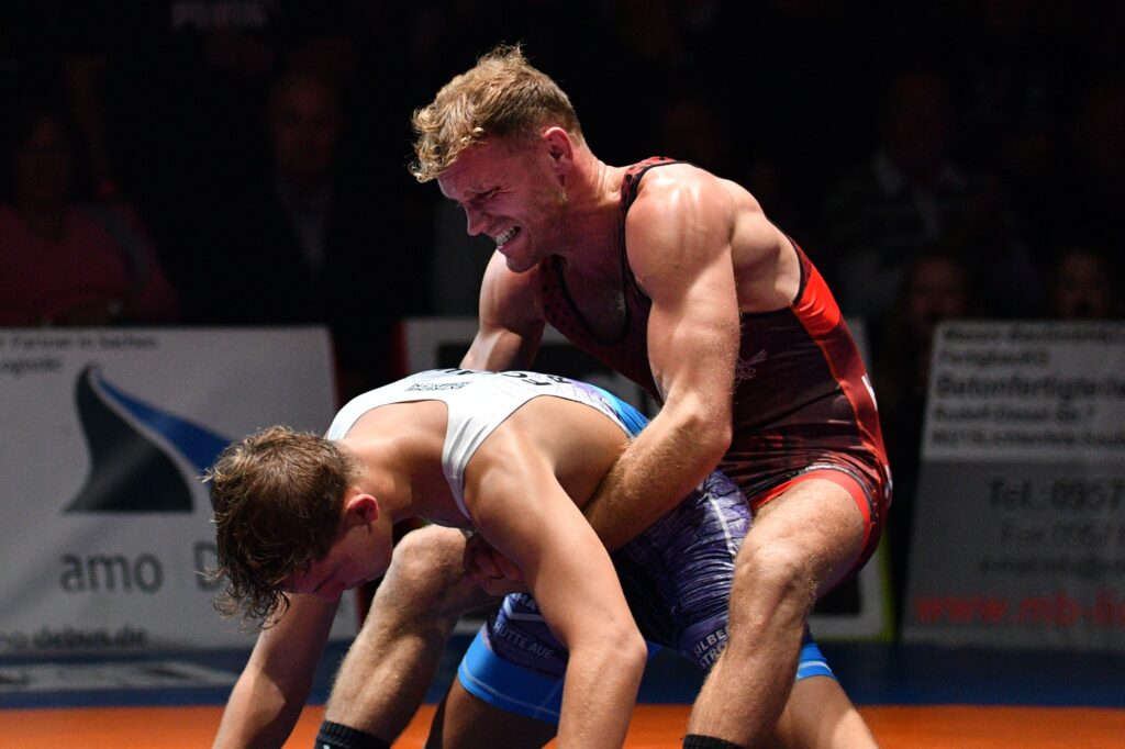 Die Halle kochte, als wenig später Aliaksandr Hushtyn (98 kg, Freistil) seinen jungen Gegner auf die Schultern zwang – Kampfzeit 1:29 Minuten!