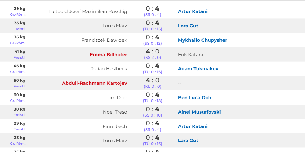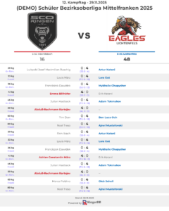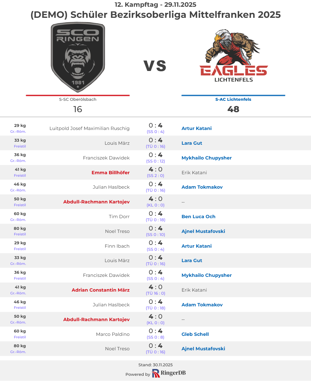 Mit einer souveränen Leistung entführten die Nachwuchsadler zwei Punkte aus Oberölsbach und konnten den zweiten Platz in der Bezirksoberliga Mittelfranken behaupten. Der Gastgeber vom SC Oberölsbach konnte auf dem Papier nur zwei Kämpfe gewinnen. Zwei Vierer kamen noch durch eine unbesetzte Klasse des ACL hinzu. Ansonsten dominierten die Ringer von Trainer Serghei Shishkov das Geschehen in der Oberpfalz. Artur Katani, Lara Gut, Ajnel Mustafoski, Mykhailo Chupysher und der deutsche Meister Adam Tokmakov konnten jeweils doppelt punkten und gewannen beide Kämpfe überlegen. Ben- Luca Och und Gleb Schell, die sich die Klasse bis 60kg teilten gewannen ebenfalls vorzeitig zum Endstand von 16:48 für die Eagles.