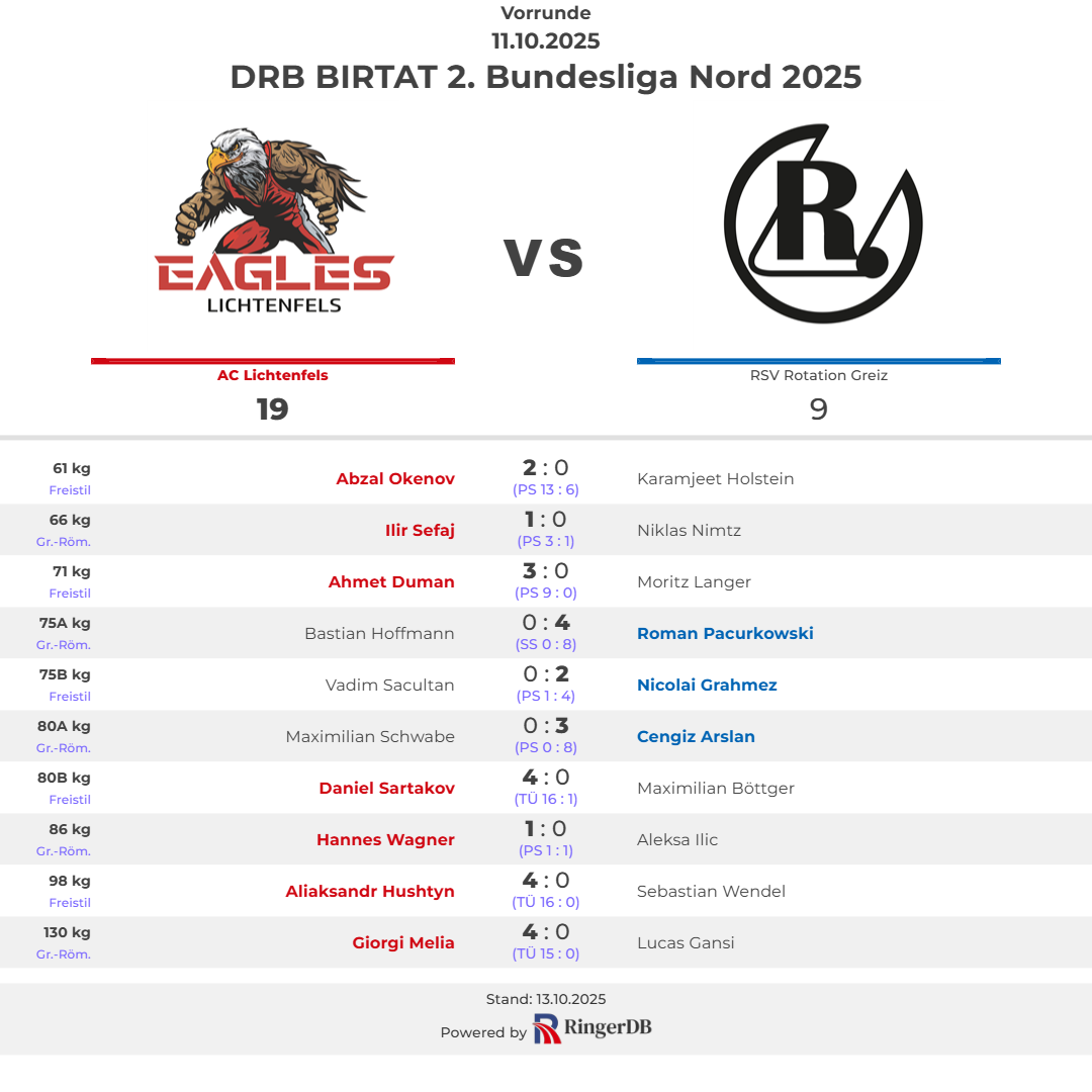 Mit einem deutlichen 19:9 setzen sich Ringer des AC Lichtenfels vor heimischem Publikum gegen den RSV Greiz durch und stehen auf Platz 1 der 2. Bundesliga Nord.
