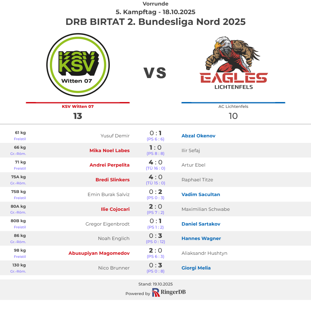 Es war nicht das Wochenende der Eagles. Mit Ambitionen die Tabellenspitze zu verteidigen, reisten Mannschaft und Betreuer am Samstag zum ebenfalls noch ungeschlagenen KSV Witten. An Bord die beiden Youngster- Neuzugänge Raphael Titze und dem aus Bindlach stammenden Artur Ebel, dem man an Stelle von Ahmed Duman Wettkampferfahrung geben wollte. Entscheidend für den Gesamtsieg der Wittener waren am Ende zwei knappe Niederlagen der Eagles- Athleten Sefai und Hushtyn vor der Wettkampfpause.